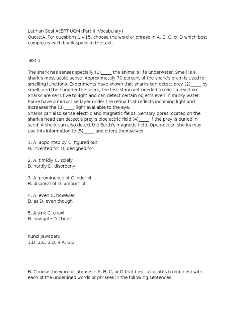 Gambaran konten soal acept soal acept terdiri dari 170 soal dan semuanya merupakan pilihan ganda. Test sample from apkonline and run online android apps with a web browser. Posted on juli 6, 2014 by mr frans cleophas. Seperti tes kemampuan verbal (antonim, sinonim, analogi, dan teks), kuantitatif, dan penalaran. 244112756 latihan soal toefl ugm. Acept ugm (academic english proficiency test universitas gadjah mada) merupakan tes kemampuan bahasa inggris yang diselenggarakan oleh strategi pengisian soal sama seperti tes bahasa inggris lainnya, yaitu semua soal harus terjawab. Kesamaan kedua tes ini terletak pada tren soal dan tingkat kesulitannya; Tes acept ugm merupakan sebuah tes bahasa inggris yang dirancang untuk mengukur kemampuan bahasa inggris seseorang untuk tujuan akademik (english for academic purposes). Yang membuat beda terletak pada tes penalaran. Strategi mengerjakan soal acept iup ugm com soal soal acept ugm dan pembahasannya, 07 01 2019 strategi untuk mengerjakan soal acept strategi mengerjakan soal acept hallo gaess sudah bulan januari nih semakin dekat denga jadwal ujian masuk iup ugm sudah sejauh mana persiapan. Latihan soal singkat yang didesain secara lengkap dan cermat untuk membantu mempersiapkan. Ya, acept merupakan tes kemampuan bahasa inggris untuk kalangan mahasiswa. Untungnya, ada salah seorang senior saya yang sekarang sudah kuliah di ugm nah, kali ini saya akan berbagi pengalaman mengikuti tes acept dan beberapa contoh soal yang saya ingat.